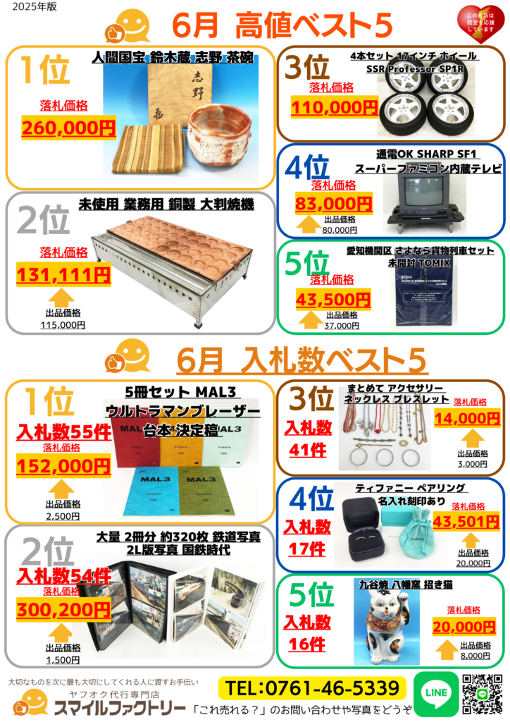 スマイルファクトリーで6月に出品・落札された商品の中から、高値ベスト5と入札数ベスト5をご紹介します。