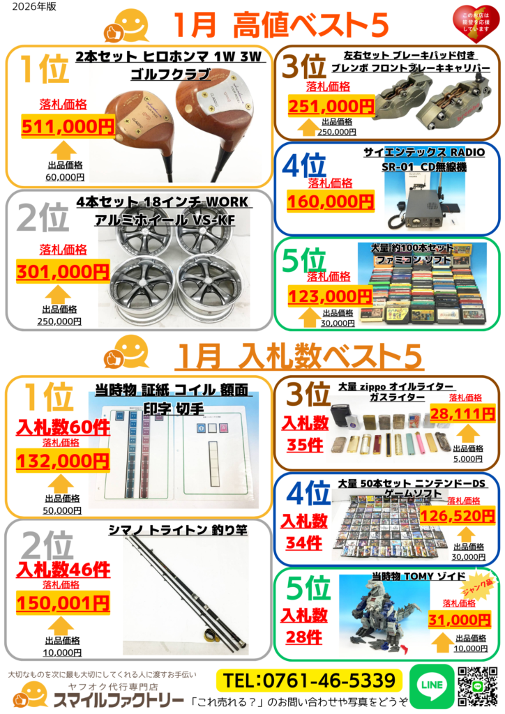 スマイルファクトリーで2026年1月に出品・落札された商品の中から、高値ベスト5入札数ベスト5をご紹介します。